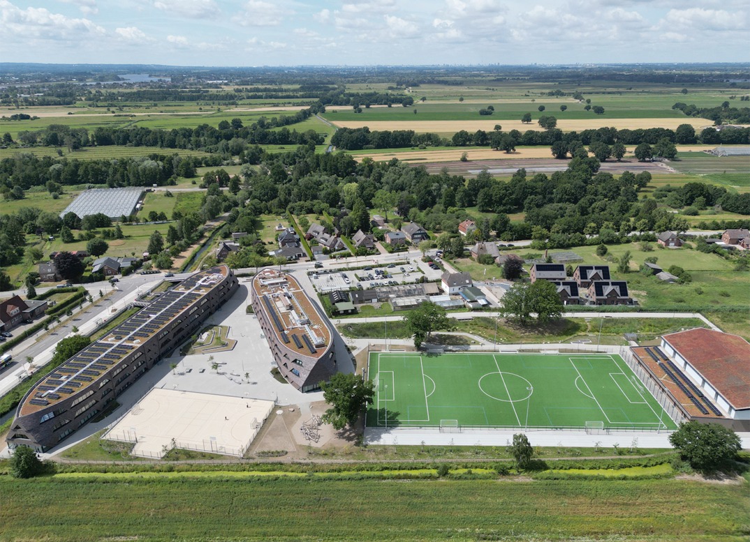 Die modernen Baukörper bilden den Rahmen für den zentral gelegenen Schulhof für die bis zu 700 Kinder der 5. – 12. Klasse.